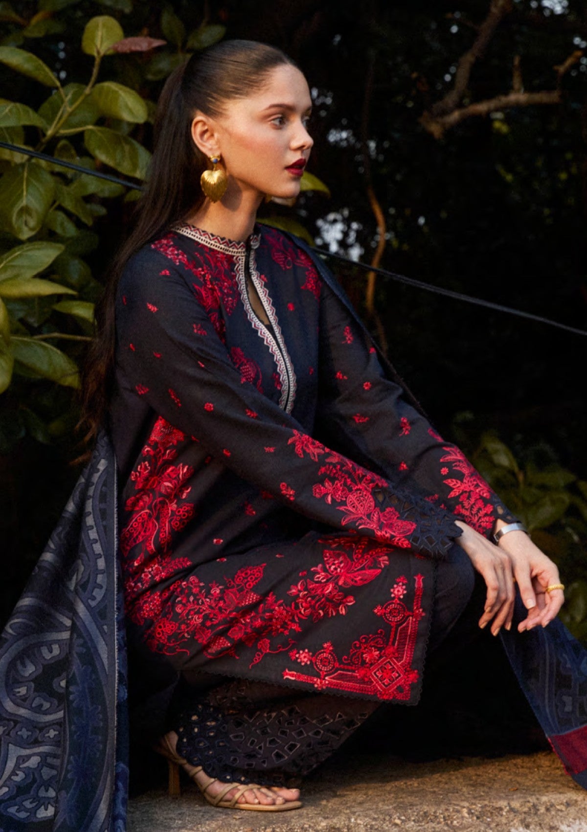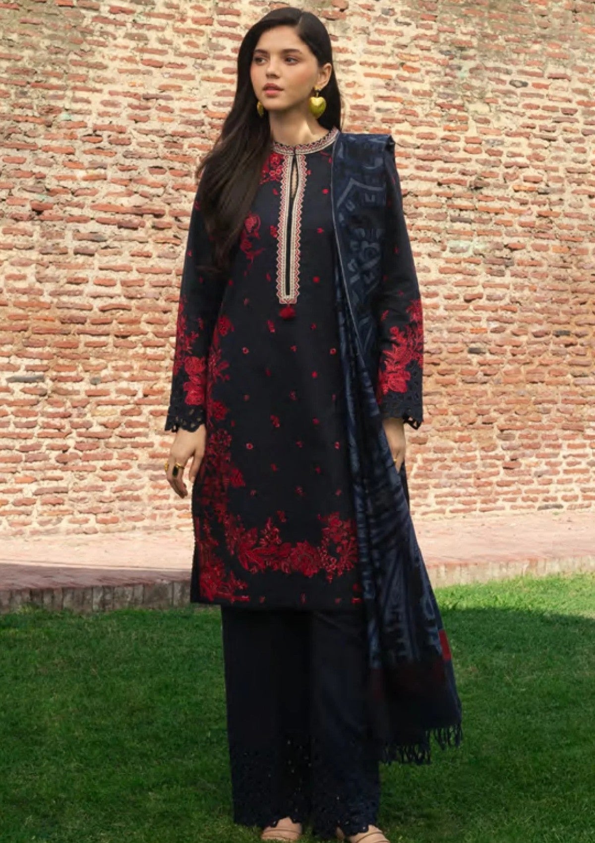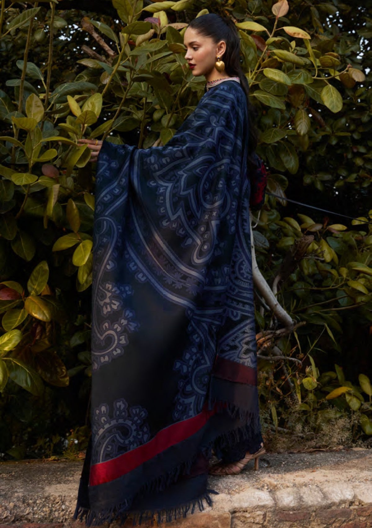 DARYA unveils a beautiful composition of floral embroidery in red on a deep blue khaddar surface, styled with a blue jacquard shawl, bringing about a seamless fusion of style andsophistication.