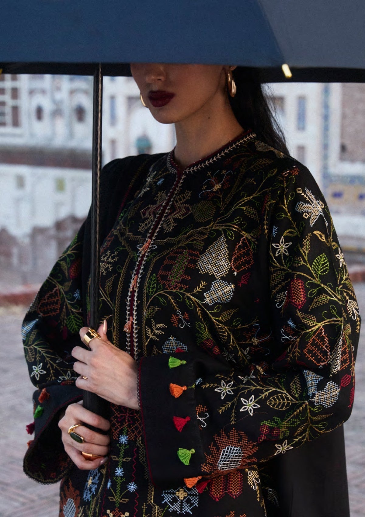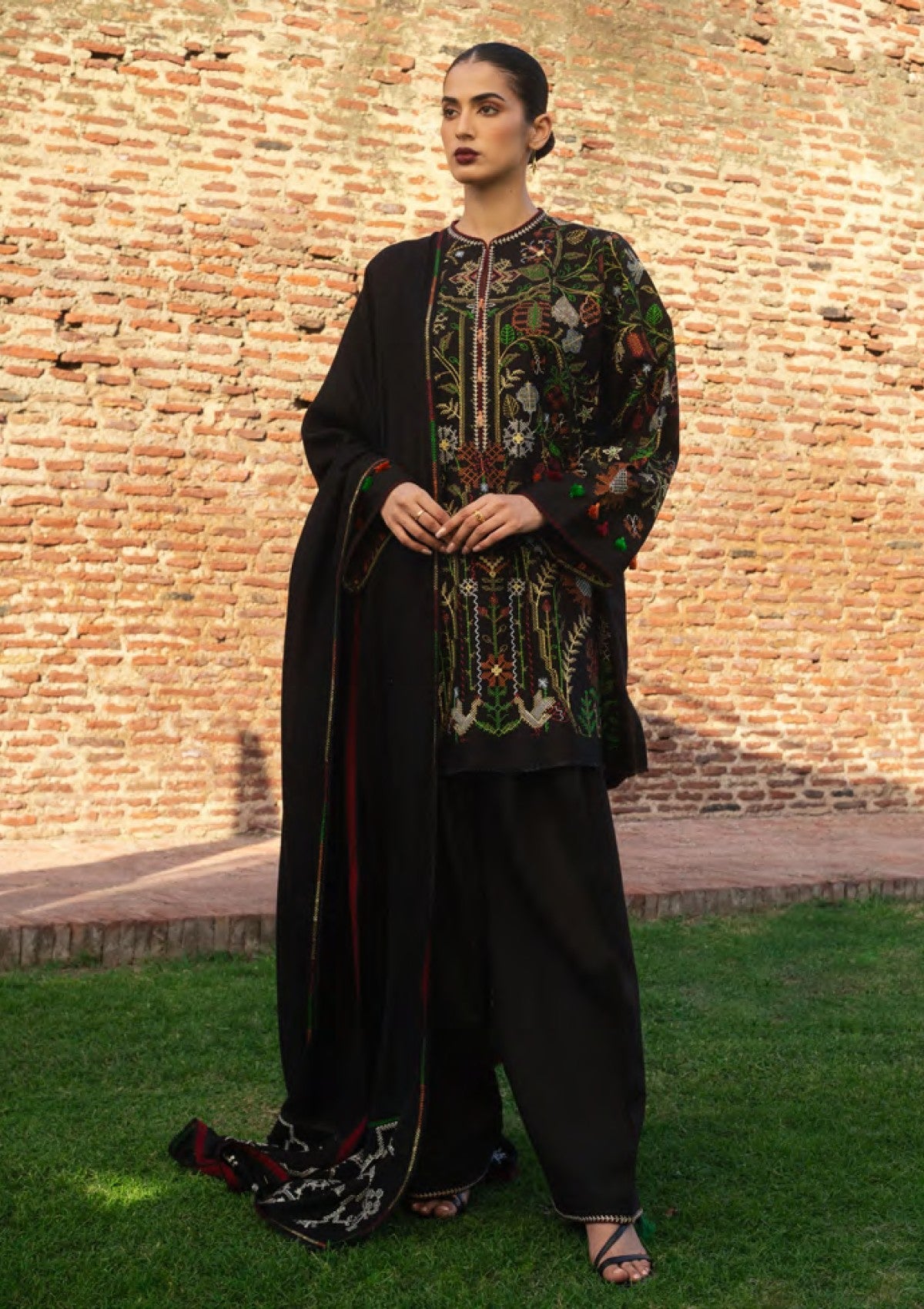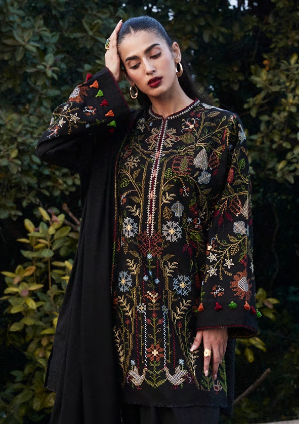 LALEH evokes a feeling of warmth. Embroidered on a black khaddar canvas, this ensemble reveals intricate cross-stitch embroidery on the shirt and a black wool shawl embroidered on all sides to wrap yourself up thiswinterseason.