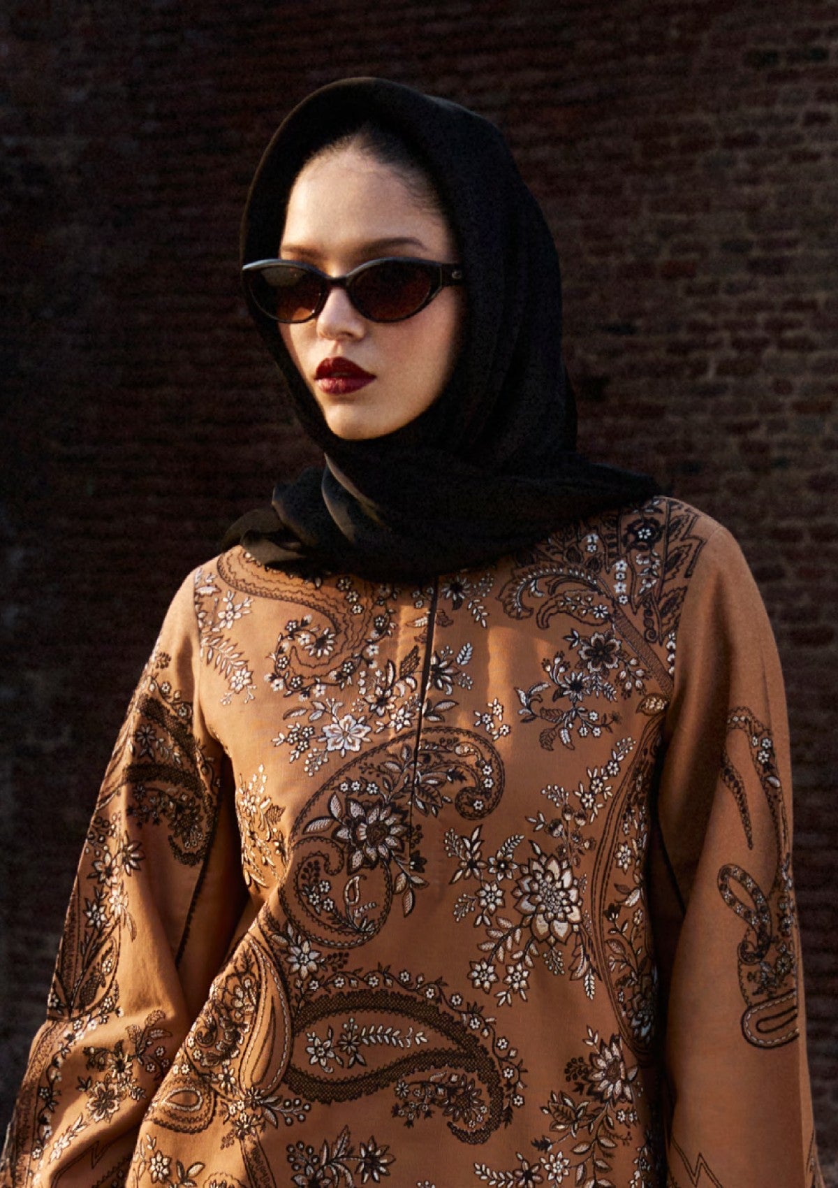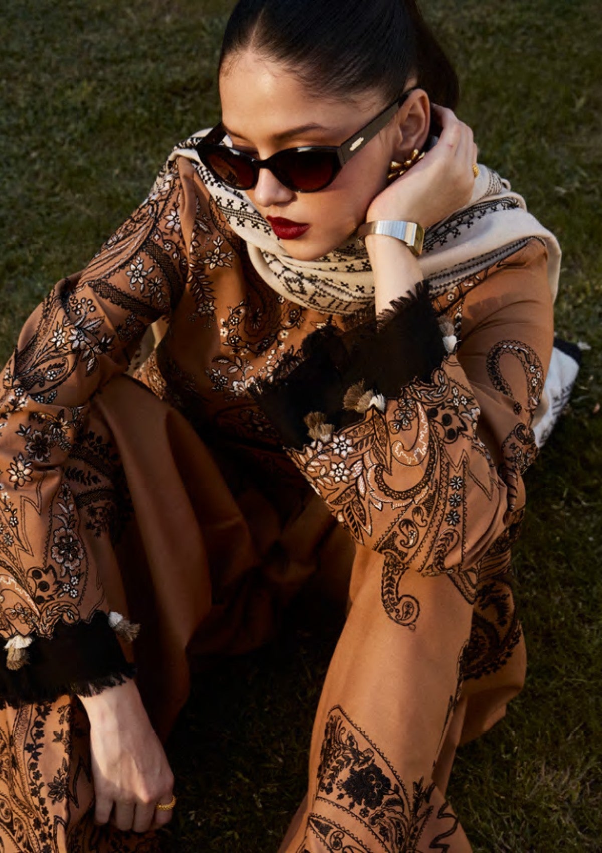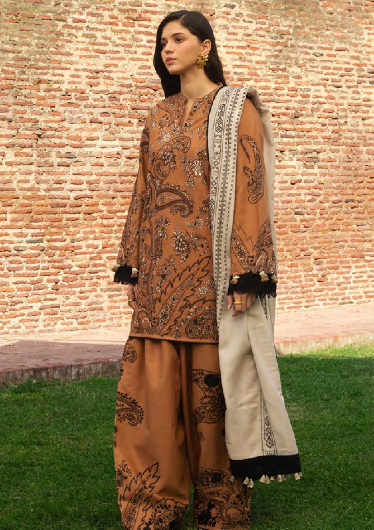 ROYA showcases a floral paisley pattern embroidered in black and beige on a clay-dyed khaddar surface. This beautiful combination is further paired with a heavily embroidered shalwar and transforms the ensemble with a beige wool shawl embroidered on all sides.
