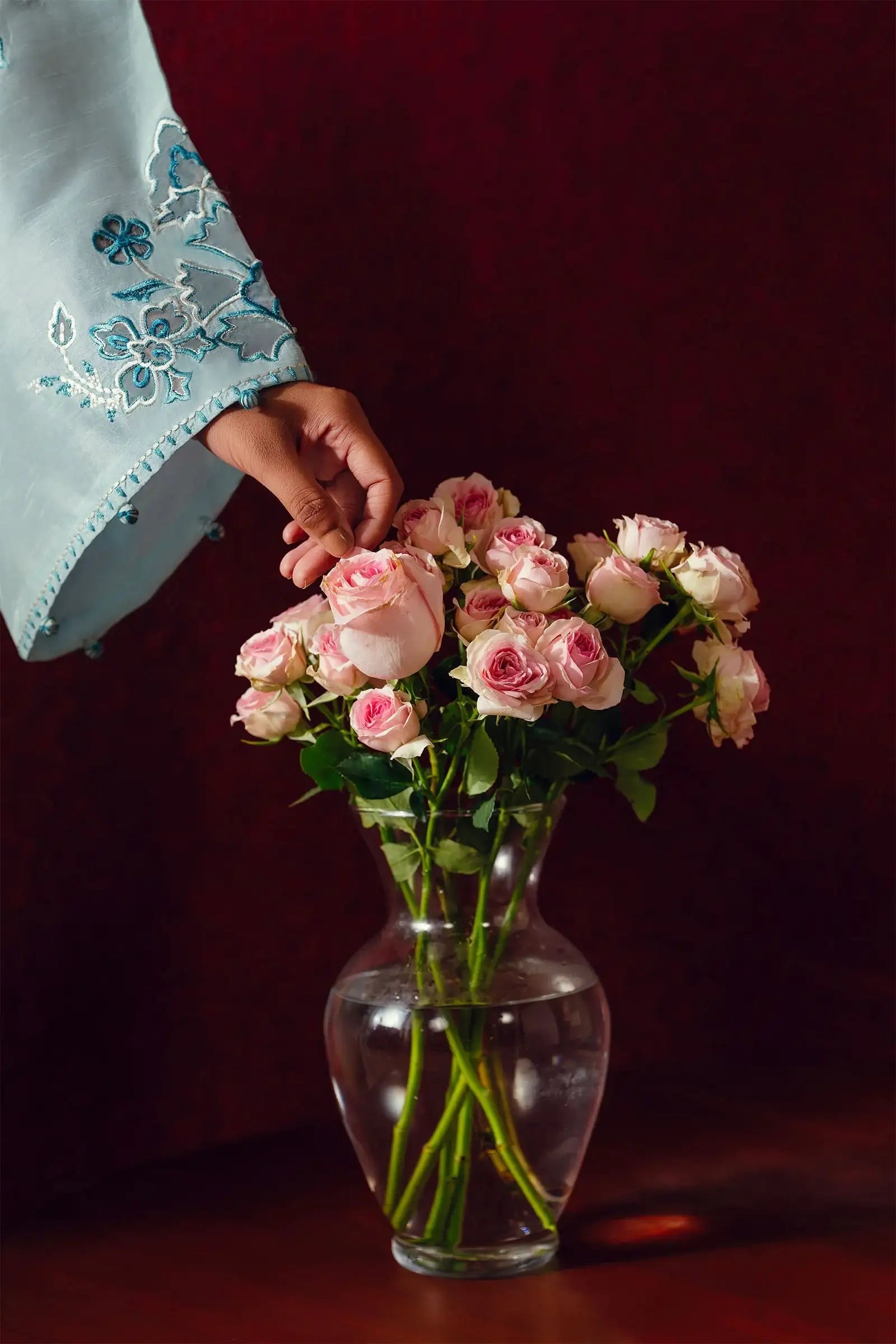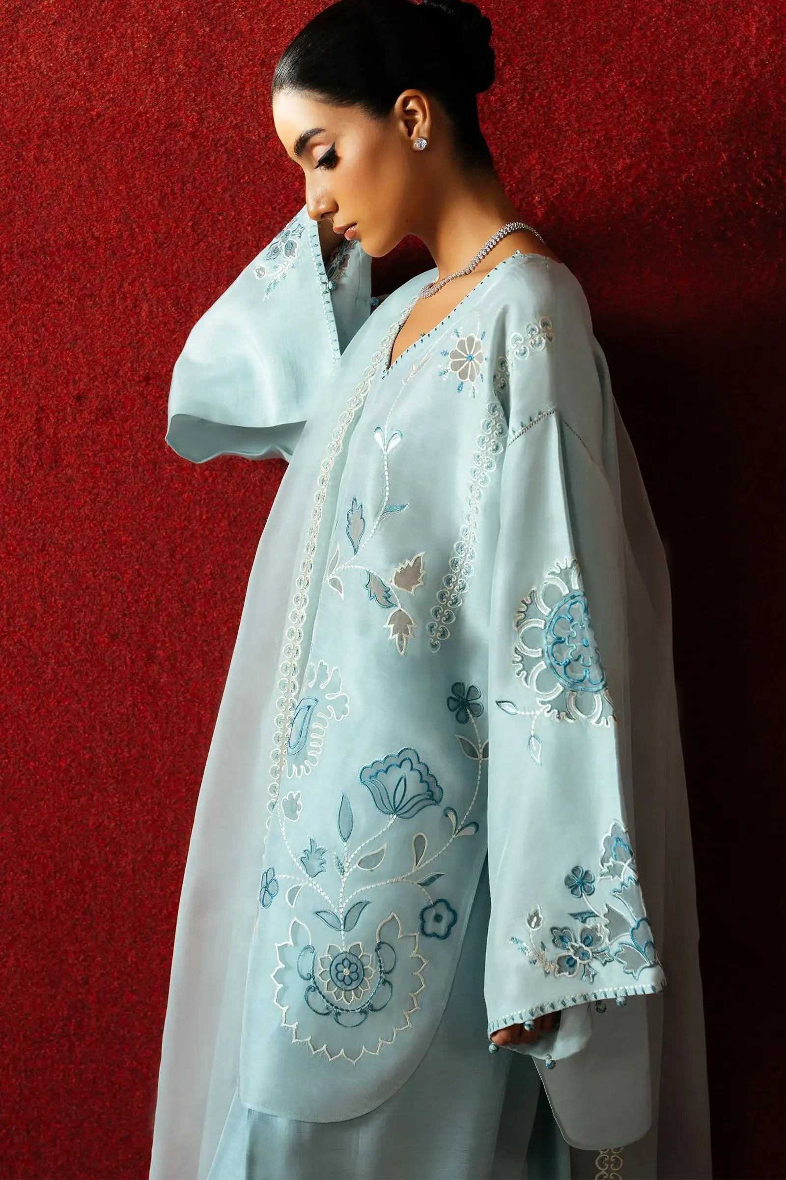 Bathed in the hush of twilight, Aveline unfolds on a celestial ice blue raw silk canvas a vision of cool serenity and quiet allure. Bold ivory and cerulean florals bloom across its surface, their laser-cut details glimmering like frozen petals beneath moonlight. The short shirt, adorned with embroidered sleeves and finished with delicate tassels, moves with a whisper of grace. Paired with a flowing farshi shalwar and an airy organza dupatta framed with an embroidered patti, this ethereal ensemble captures the mood of a winter dream feminine, moody, and beautifully untamed, where every thread tells a story of light meeting shadow.
