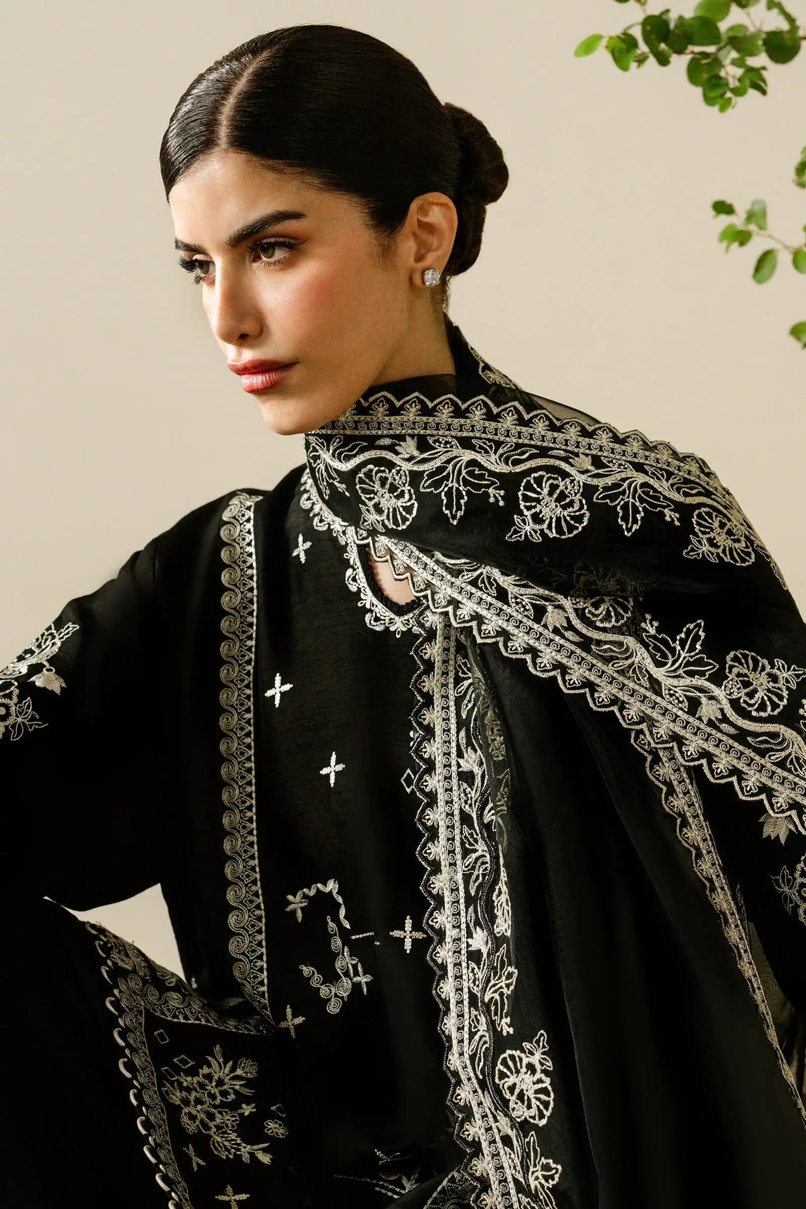 An enigmatic shade of ebony forms the canvas for Noctis, where moonlit geometry and delicate florals entwine in a dance of light and shadow. Lustrous ivory threads trace graceful patterns across the raw silk, as butterflies drift like fleeting dreams through the night sky. The look is completed with an ethereal organza dupatta, intricately embroidered in soft florals, and a tonal tapered shalwar finished with refined stitch detailing. Enigmatic, elegant, and endlessly captivating Noctis embodies the poetry of twilight, where silk shimmers like starlight and every detail whispers quiet luxury.