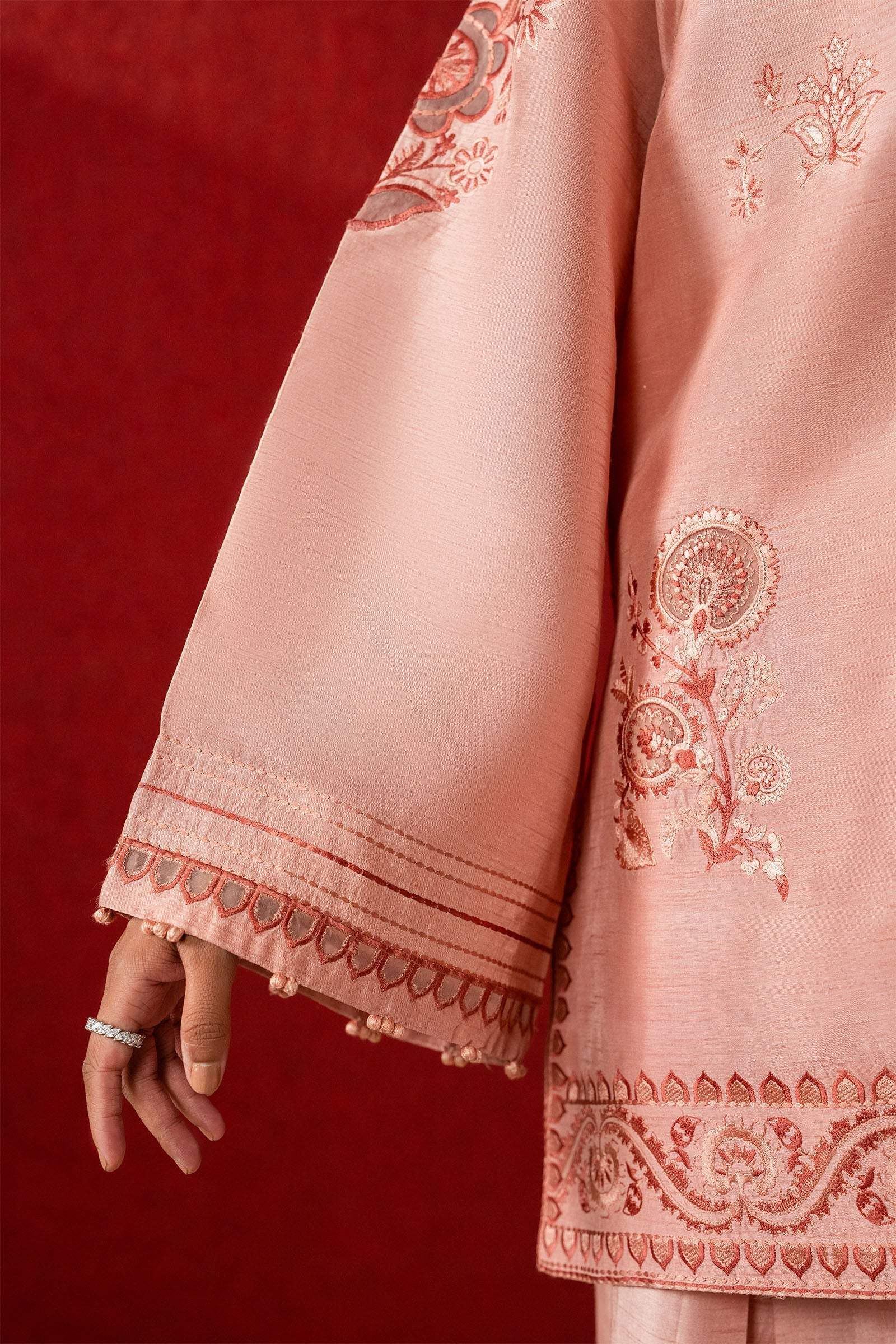 Awash in the glow of dawn, Roselynne unfolds on a poetic salmon pink raw silk canvas, where delicate tonal florals bloom in whispers of embroidery, entwined with intricate laser-cut details and framed by gossamer organza lace. The tonal farshi shalwar, adorned with embroidered borders and airy laser accents, flows with quiet refinement, while a scalloped organza dupatta ethereal and exquisitely embroidered drifts like a breath of morning light. Dreamy, romantic, and timelessly poised, Roselynne embodies the serene allure of fall where silk glows softly, and elegance lingers like a memory.